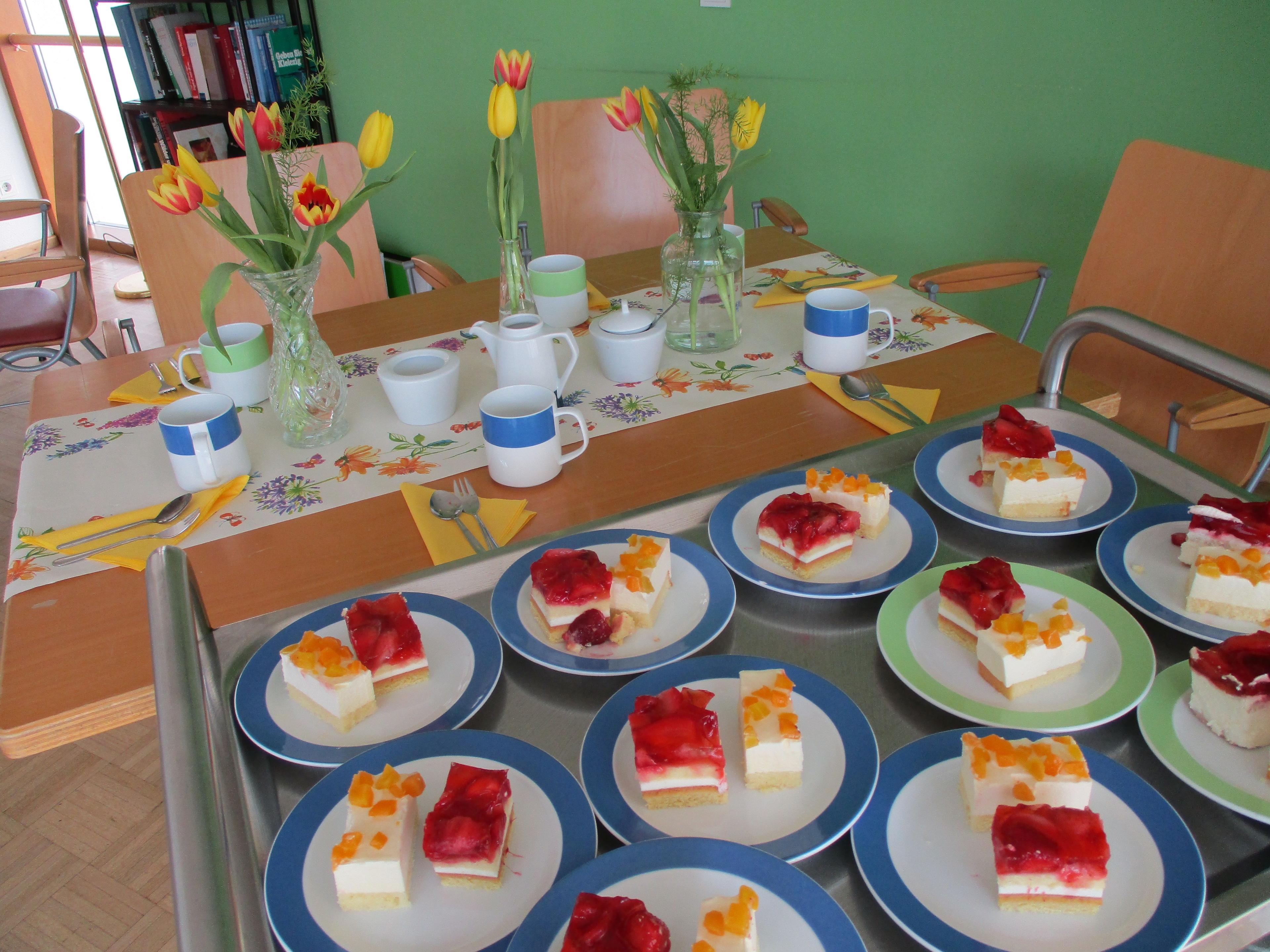 Zusammen mit unseren Bewohner*innen konnten wir je einen schönen Nachmittag verbringen. Zum Kaffee gab es leckeren Erdbeer- und Pfirsichkuchen. Die Tische waren mit Blumen dekoriert.