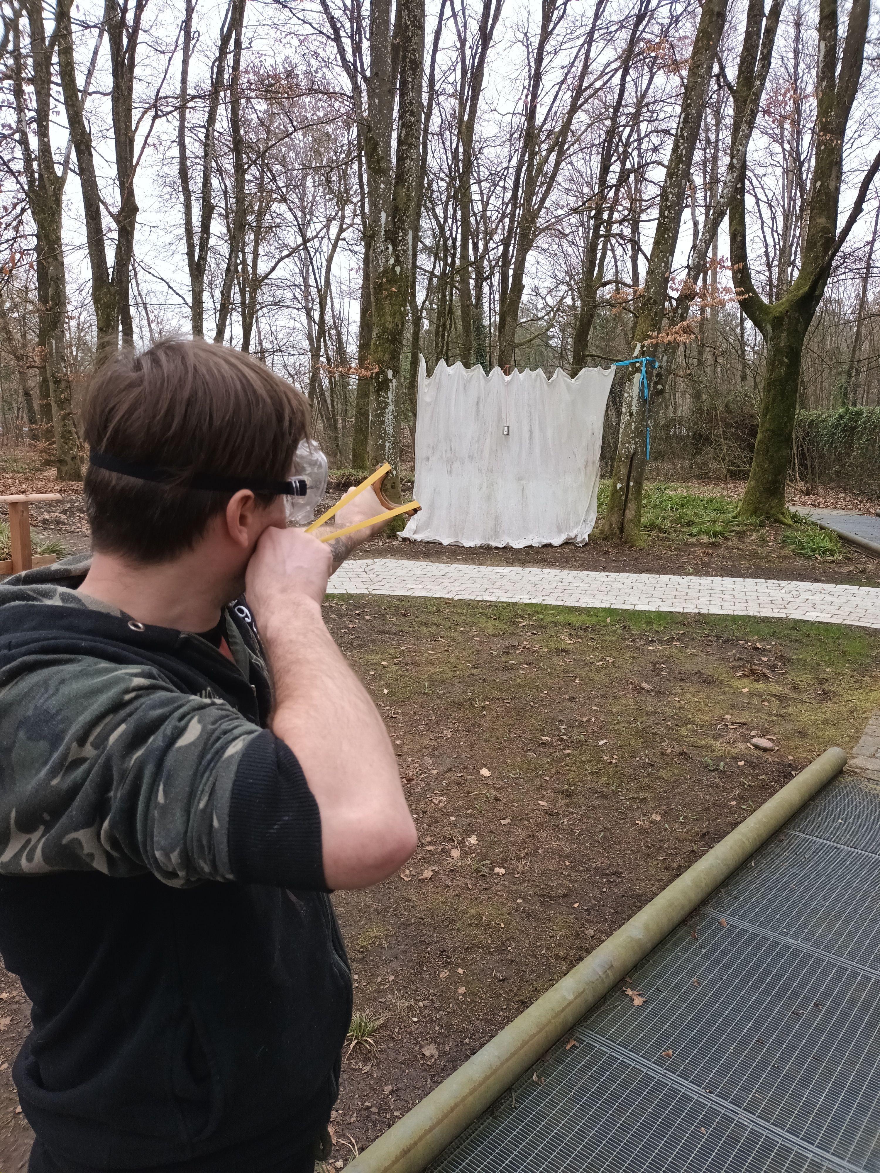 Doch einfach eine kaufen wäre doch viel zu langweilig gewesen. Daher wurde Material organisiert, Fachliteratur gewälzt und notwendiges Werkzeug besorgt. Nachdem dann jeder seine bevorzugte Form der Steinschleuder ausgesucht hatte, wurde gesägt, geschliffen, teilweise ein wenig geflucht und nochmal von vorn begonnen, es wurde gelernt, wie man Latexbänder zuschneidet und die dann an der Steinschleuder befestigt werden.